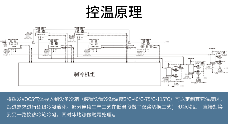 將揮發(fā)VOCs氣體導(dǎo)入到設(shè)備冷箱(裝置設(shè)置冷凝溫度 3C -40C -75C -115C)可以定制其他溫度區(qū),根據(jù)需求進(jìn)行逐級(jí)冷凝液化。部分連續(xù)生產(chǎn)工藝在低溫段做了雙路切換工藝(一側(cè)冰堵后,直接切換到另一路換熱冷箱冷凝,同時(shí)冰堵側(cè)做融霜處理)。