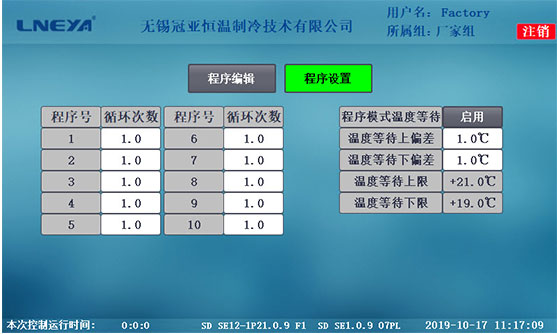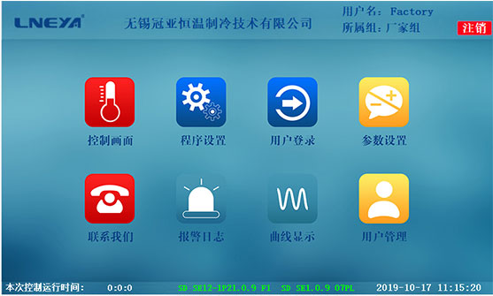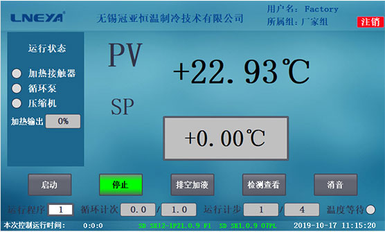 控制畫面,設(shè)置控溫參數(shù),查看實(shí)時(shí)溫度,同時(shí)可以檢測(cè)查看制冷機(jī)組、加熱器、循環(huán)泵工作狀態(tài),當(dāng)前的溫度控制模式,解熱排空的狀態(tài)