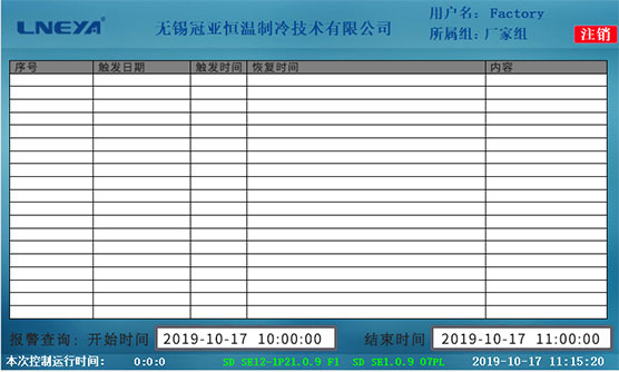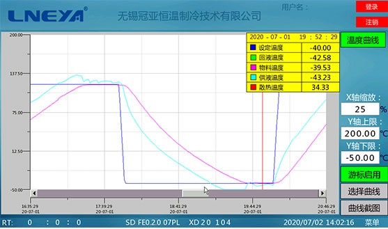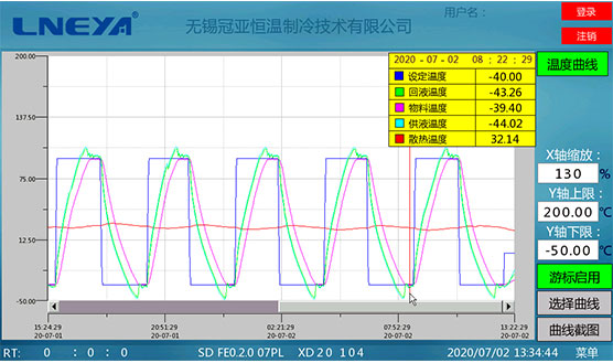 清晰曲線顯示,曲線包含設(shè)定溫度、供回液溫度、物料溫度及散熱溫度,可自由選擇是否顯示。同時(shí)對(duì)溫度的上限和下限進(jìn)行設(shè)置,支持曲線截圖保存